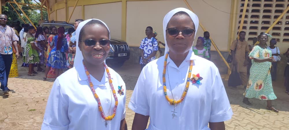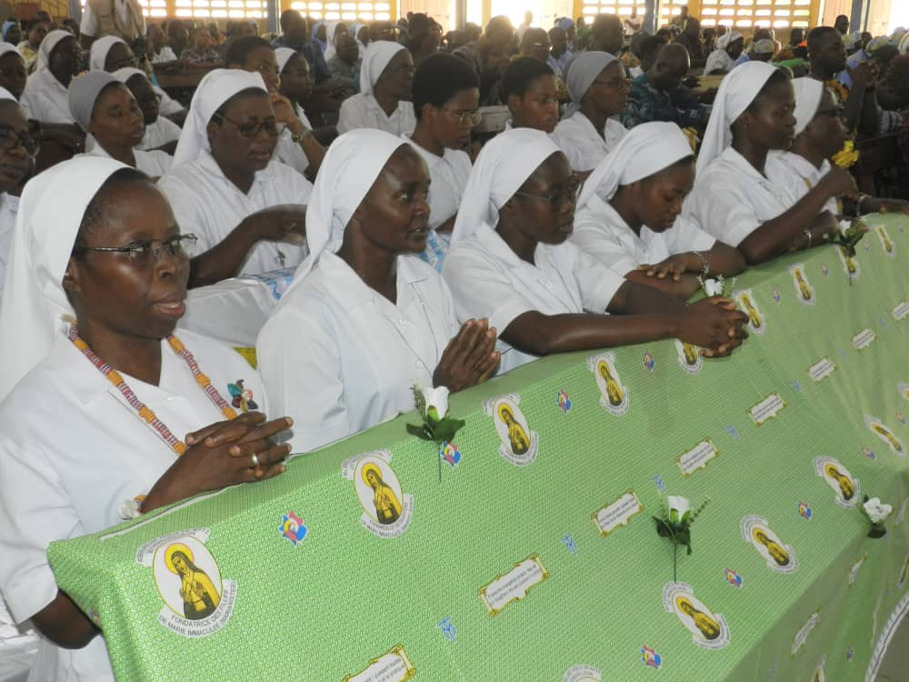 Le samedi 06 septembre, la cathédrale Saint-Pierre et Paul a vibré au rythme de l’action de grâce de la communauté des Filles de Marie Immaculée communément appelé Sœurs marianistes. Quatre novices (Faustine, Julianne, Félicité, cathérine) y ont prononcé leurs premiers vœux religieux, tandis que deux sœurs, Anne Martine DIWIZIE, supérieure régional et Marie Christine TINDADEBA, ont célébré leur jubilé d’argent de vie religieuse.